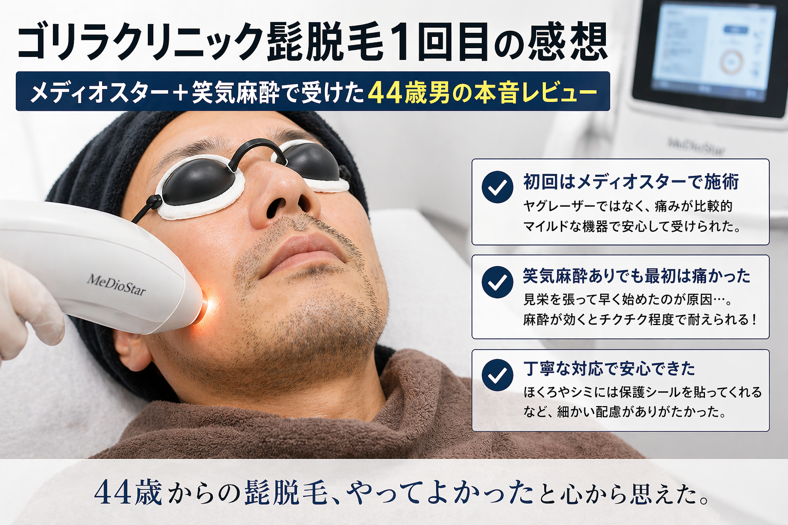 ゴリラクリニック髭脱毛1回目の感想|メディオスター+笑気麻酔で受けた44歳男の本音レビュー